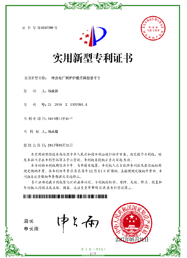 新闻中心下支撑折叠式锅炉炉膛检修平台行业首项国家专利发明者